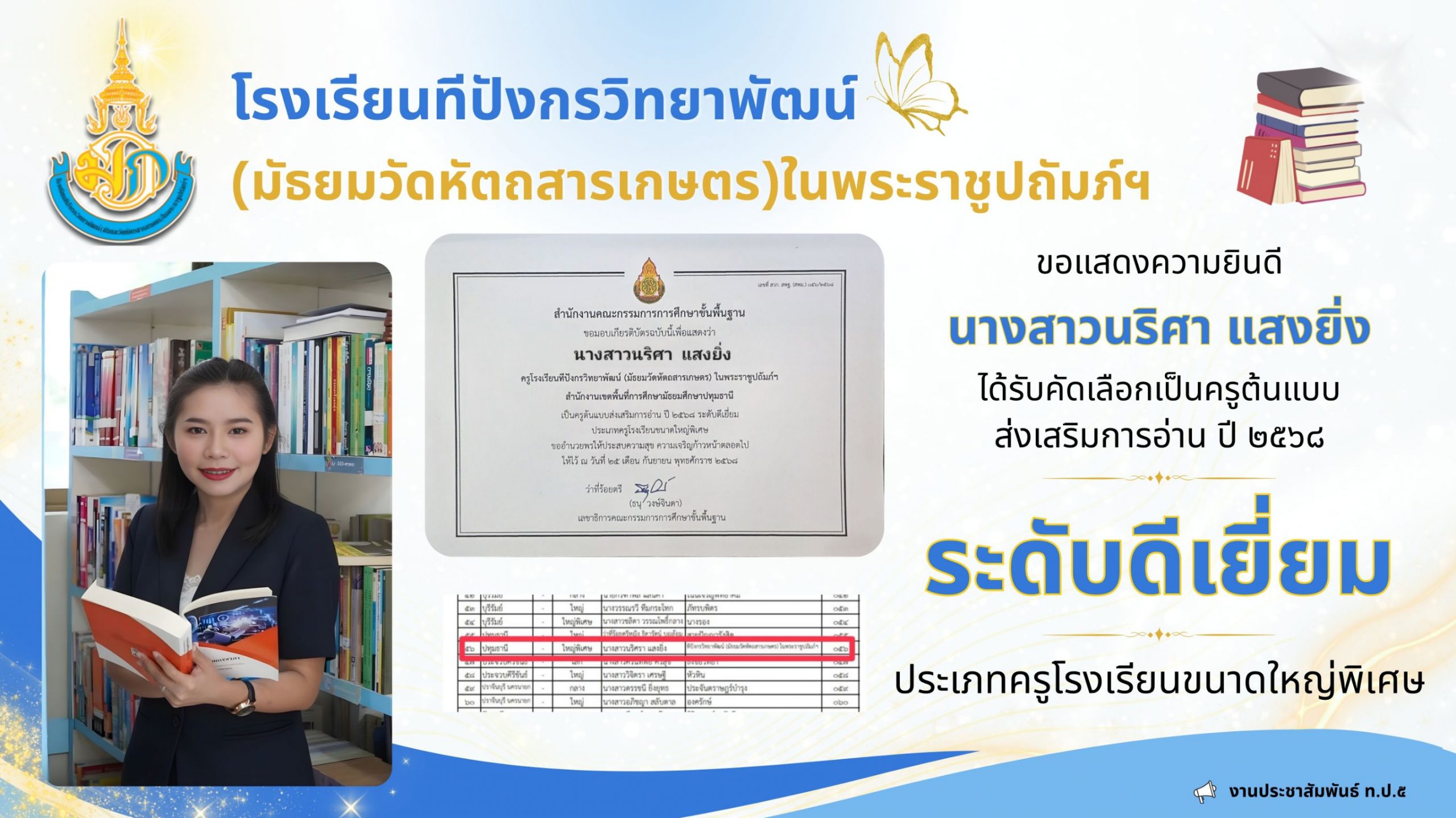 โรงเรียนทีปังกรวิทยาพัฒน์(มัธยมวัดหัตถสารเกษตร)ในพระราชูปถัมภ์ฯ ขอเเสดงความดีกับ นางสาว นริศา เเสงยิ่ง ครูผู้สอน วิชาเอกบรรณารักษ์ ในโอกาสได้รับคัดเลือกเป็นครูต้นเเบบส่งเสริมการอ่าน ประจำปี๒๕๖๘ ระดับ”ดีเยี่ยม” ประเภทครูโรงเรียนขนาดใหญ่พิเศษ