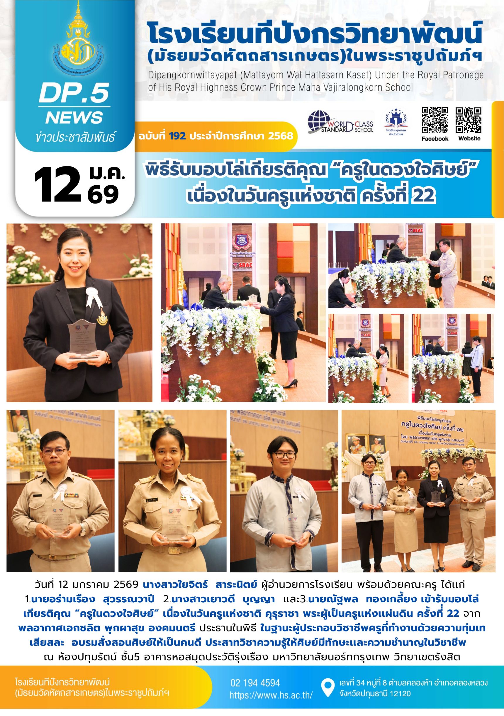 จุลสารฉบับที่ 192/2568 📌หัวข้อ : พิธีรับมอบโล่เกียรติคุณ “ครูในดวงใจศิษย์”เนื่องในวันครูเเห่งชาติ ครั้งที่ 22 15 ม.ค. 2569นายนวรัตน์ สุขสำราญข่าวประชาสัมพันธ์