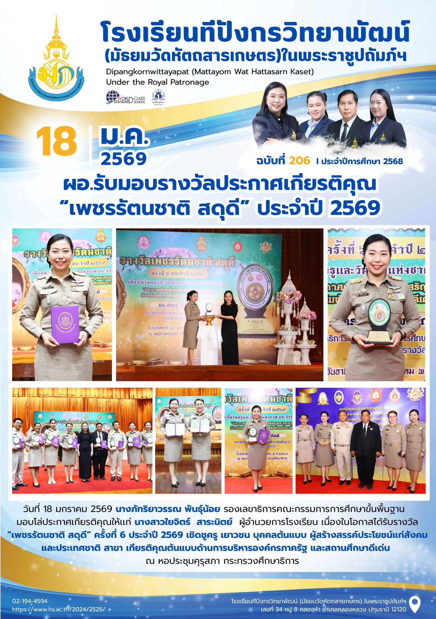 จุลสารฉบับที่ 206/2568 📌หัวข้อ : ผอ.รับมอบรางวัลประกาศเกียรติคุณ “เพชรรัตนชาติ สดุดี” ประจำปี 2569 19 ม.ค. 256928 ม.ค. 2026นายนวรัตน์ สุขสำราญข่าวประชาสัมพันธ์