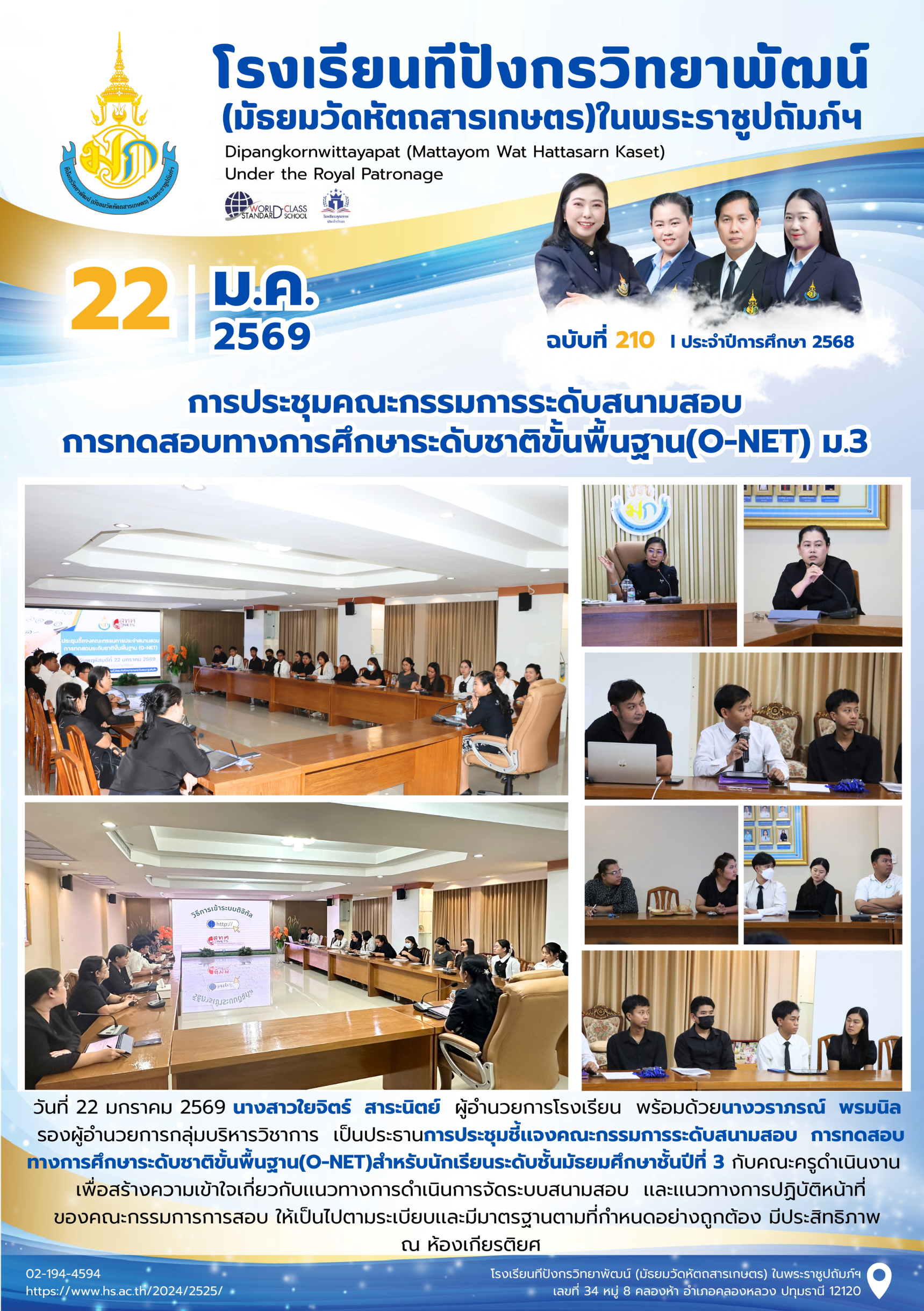 จุลสารฉบับที่ 210/2568 📌หัวข้อ : การประชุมคณะกรรมการระดับสนามสอบ การทดสอบทางการศึกษาระดับชาติขั้นพื้นฐาน(O-NET) ม.3 22 ม.ค. 256928 ม.ค. 2026นายนวรัตน์ สุขสำราญข่าวประชาสัมพันธ์