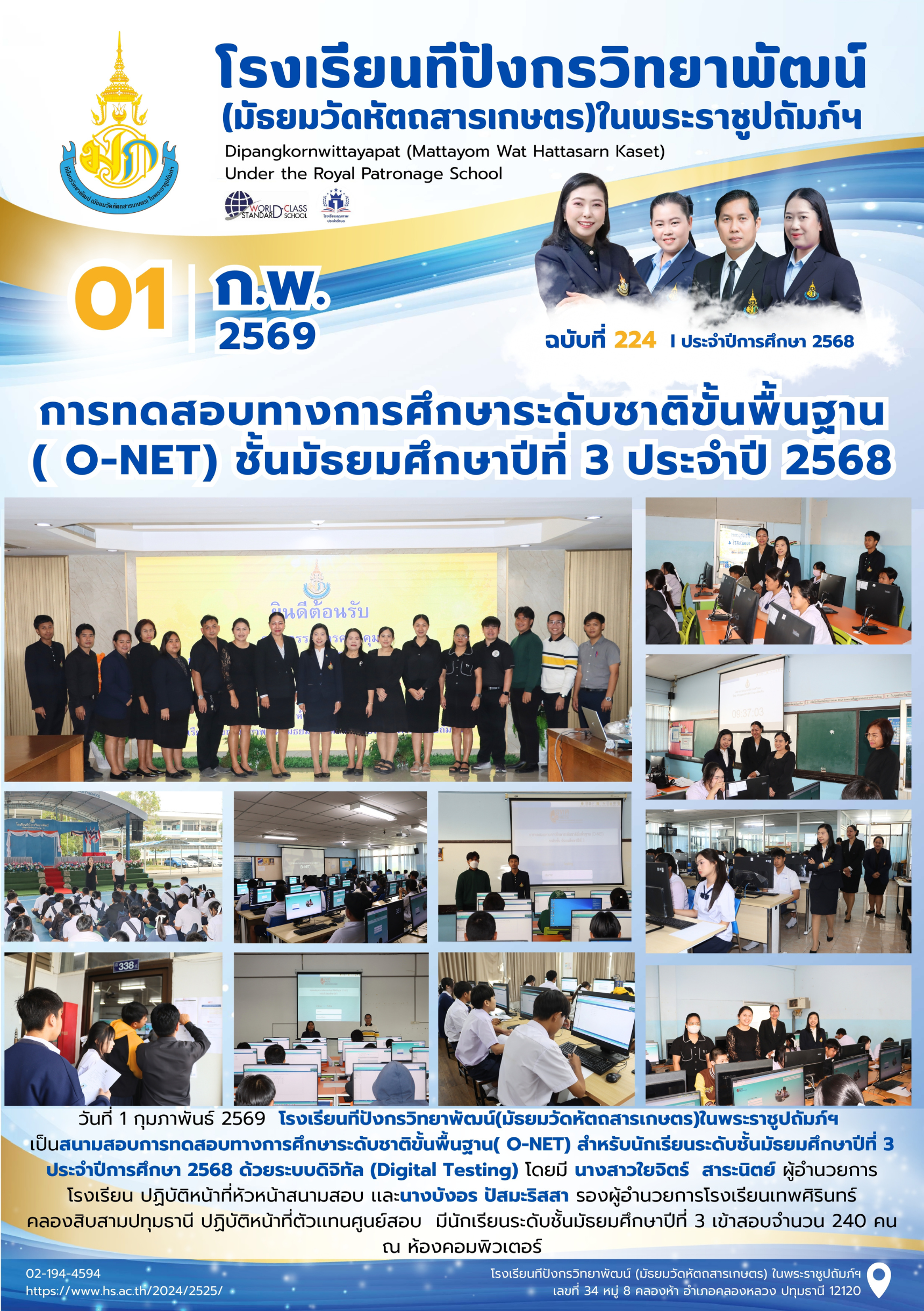 จุลสารฉบับที่ 224/2568 📌หัวข้อ : การทดสอบทางการศึกษาระดับชาติขั้นพื้นฐาน ( O-NET) ชั้นมัธยมศึกษาปีที่ 3 ประจำปี 2568 3 ก.พ. 2569นายนวรัตน์ สุขสำราญข่าวประชาสัมพันธ์