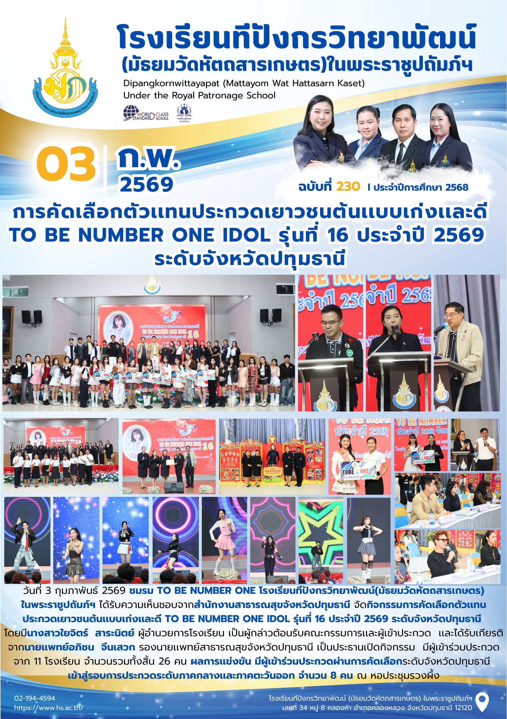 จุลสารฉบับที่ 230/2568 📌หัวข้อ : การคัดเลือกตัวเเทนประกวดเยาวชนต้นเเบบเก่งเเละดี TO BE NUMBER ONE IDOL รุ่นที่ 16 ประจำปี 2569 ระดับจังหวัดปทุมธานี 16 ก.พ. 2569นายนวรัตน์ สุขสำราญข่าวประชาสัมพันธ์