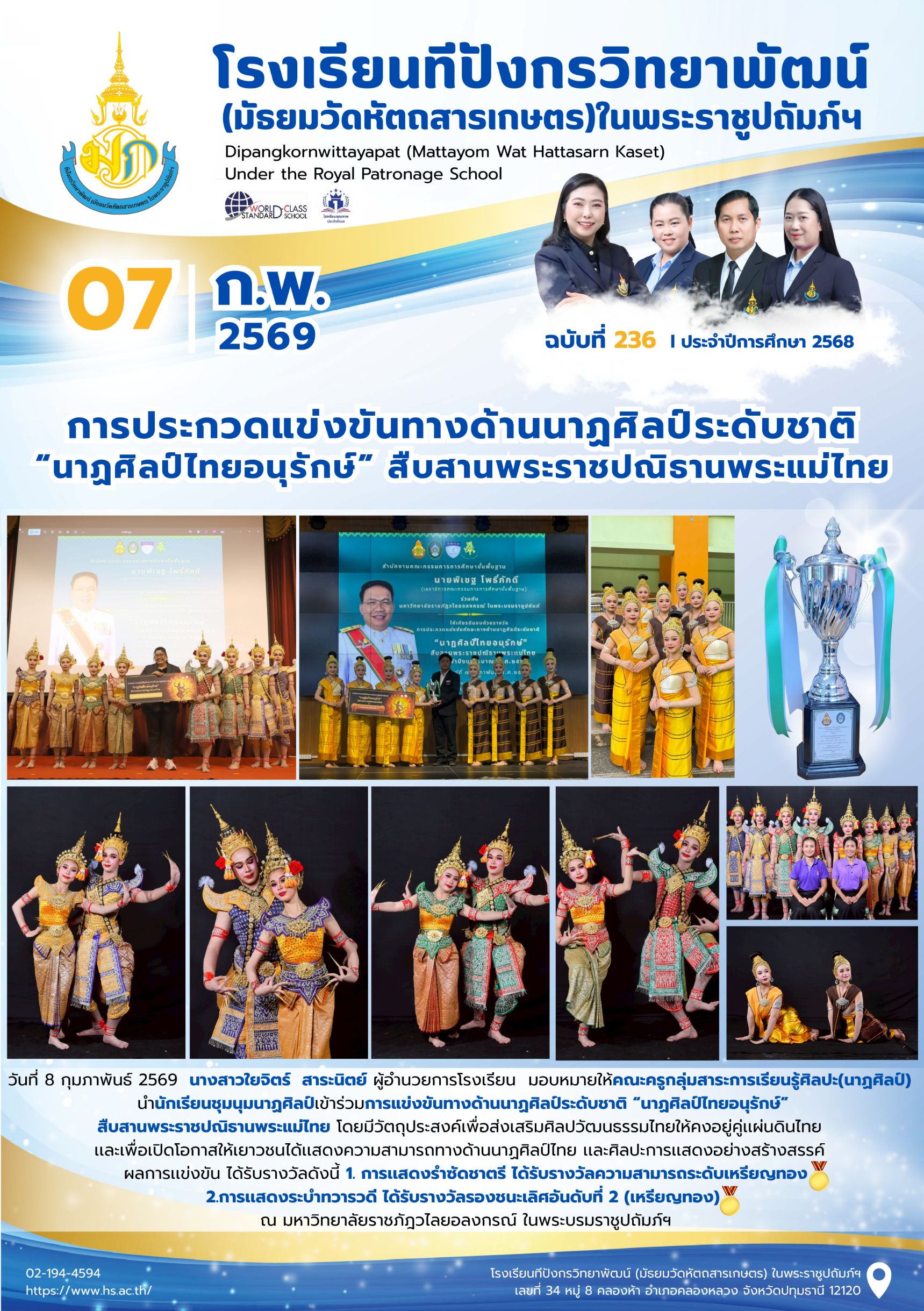 จุลสารฉบับที่ 236/2568 📌หัวข้อ : การประกวดเเข่งขันทางด้านนาฏศิลป์ระดับชาติ”นาฏศิลป์ไทยอนุรักษ์” สืบสานพระราชปณิธานพระเเม่ไทย 16 ก.พ. 2569นายนวรัตน์ สุขสำราญข่าวประชาสัมพันธ์