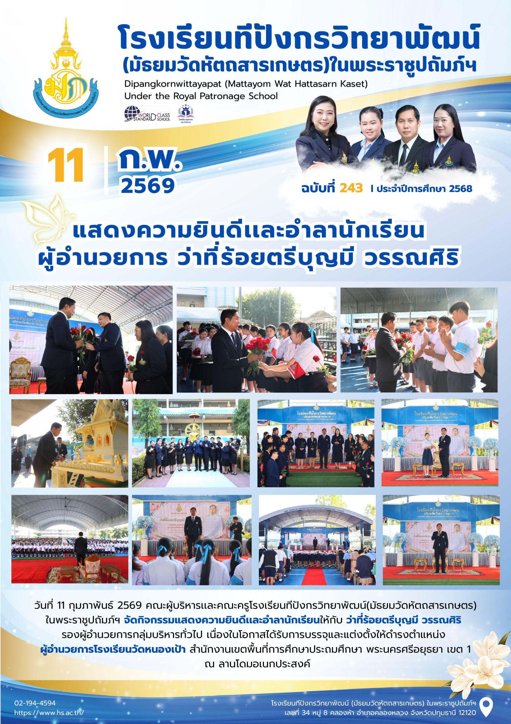 จุลสารฉบับที่ 243/2568 📌หัวข้อ : แสดงความยินดีเเละอำลานักเรียน ผู้อำนวยการ ว่าที่ร้อยตรีบุญมี วรรณศิริ 16 ก.พ. 2569นายนวรัตน์ สุขสำราญข่าวประชาสัมพันธ์