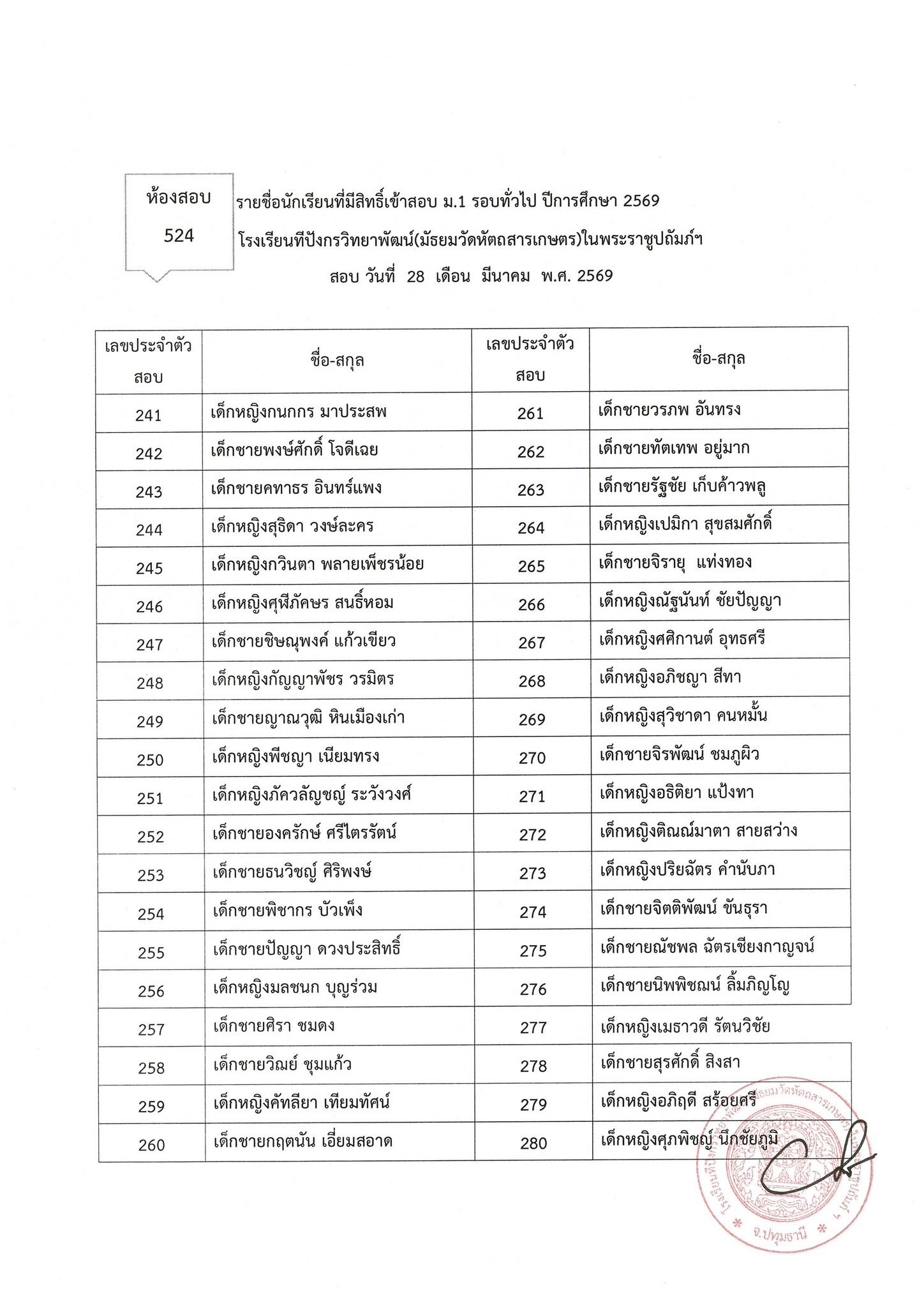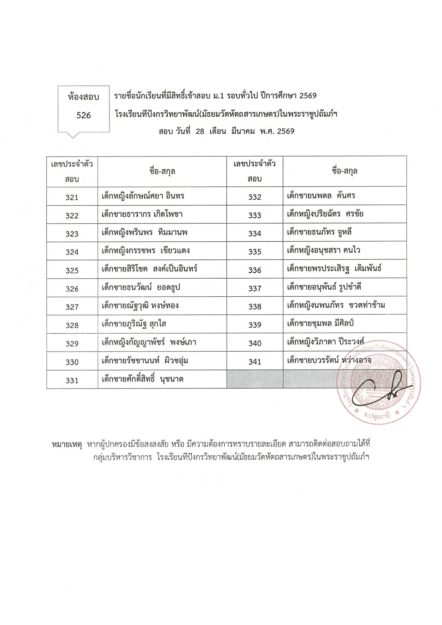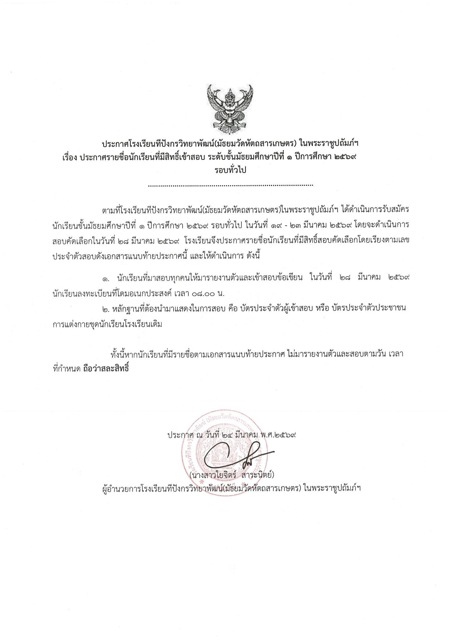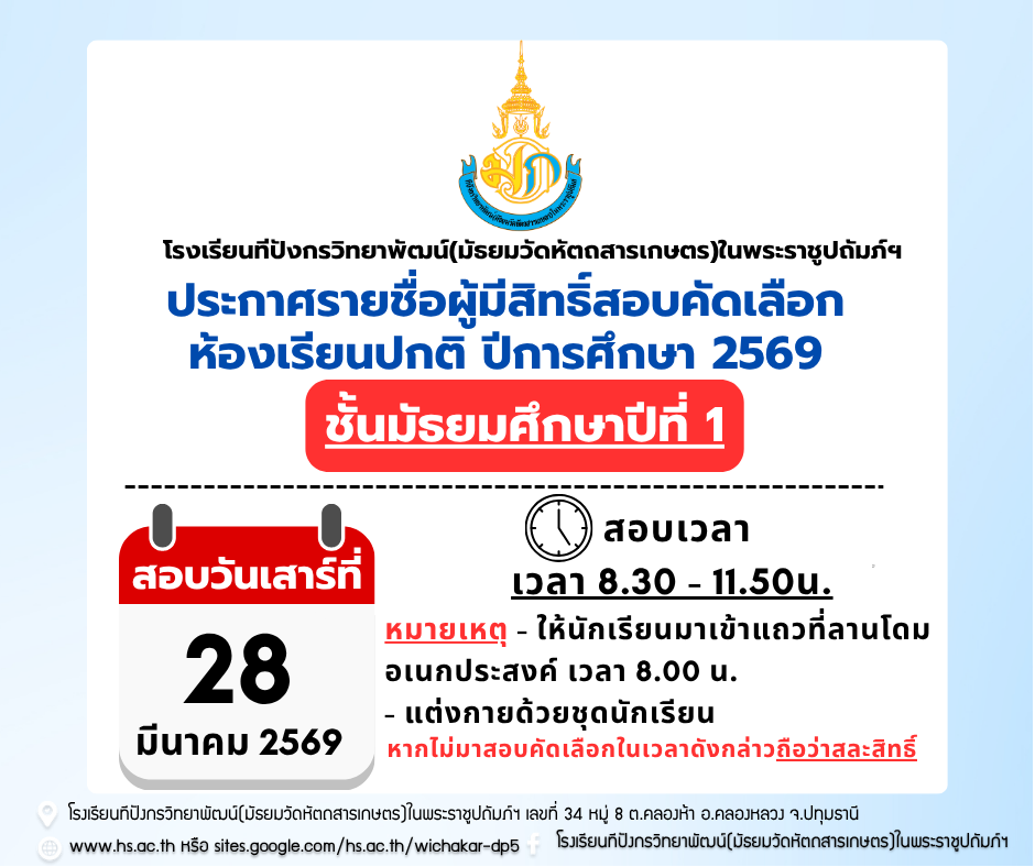 ประกาศรายชื่อผู้มีสิทธิ์สอบคัดเลือก ชั้นมัธยมศึกษาปีที่ 1 ห้องเรียนปกติ ปีการศึกษา 2569 สอบวันเสาร์ที่ 28 มีนาคม 2569 เวลา เวลา 8:30 – 11:50 น. หมายเหตุ แต่งกายด้วยชุดนักเรียน หากไม่มาสอบคัดเลือกในเวลาดังกล่าวถือว่าสละสิทธิ์ 24 มี.ค. 2569นายนวรัตน์ สุขสำราญประกาศ