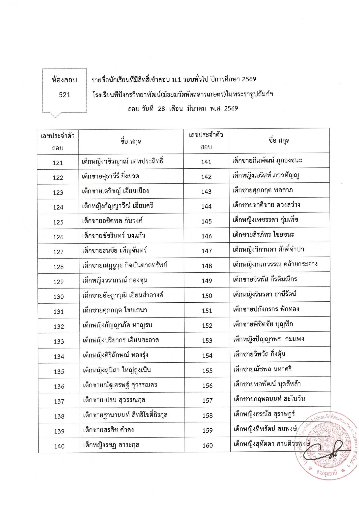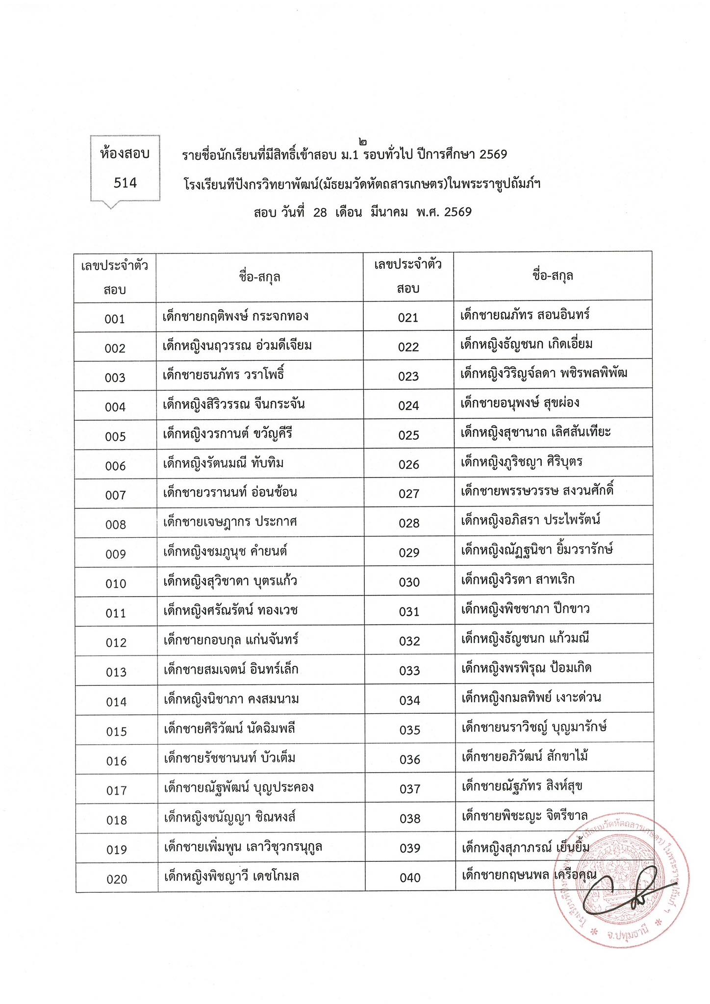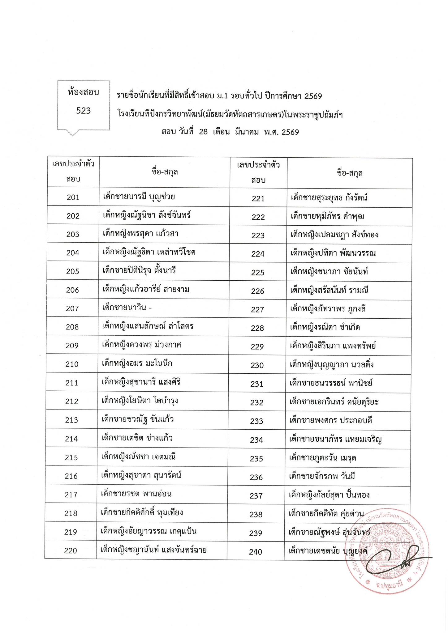 ประกาศรายชื่อผู้มีสิทธิ์สอบคัดเลือก ชั้นมัธยมศึกษาปีที่ 1 ห้องเรียนปกติ ปีการศึกษา 2569 สอบวันเสาร์ที่ 28 มีนาคม 2569 เวลา เวลา 8:30 – 11:50 น. หมายเหตุ แต่งกายด้วยชุดนักเรียน หากไม่มาสอบคัดเลือกในเวลาดังกล่าวถือว่าสละสิทธิ์ 24 มี.ค. 2569นายนวรัตน์ สุขสำราญประกาศ