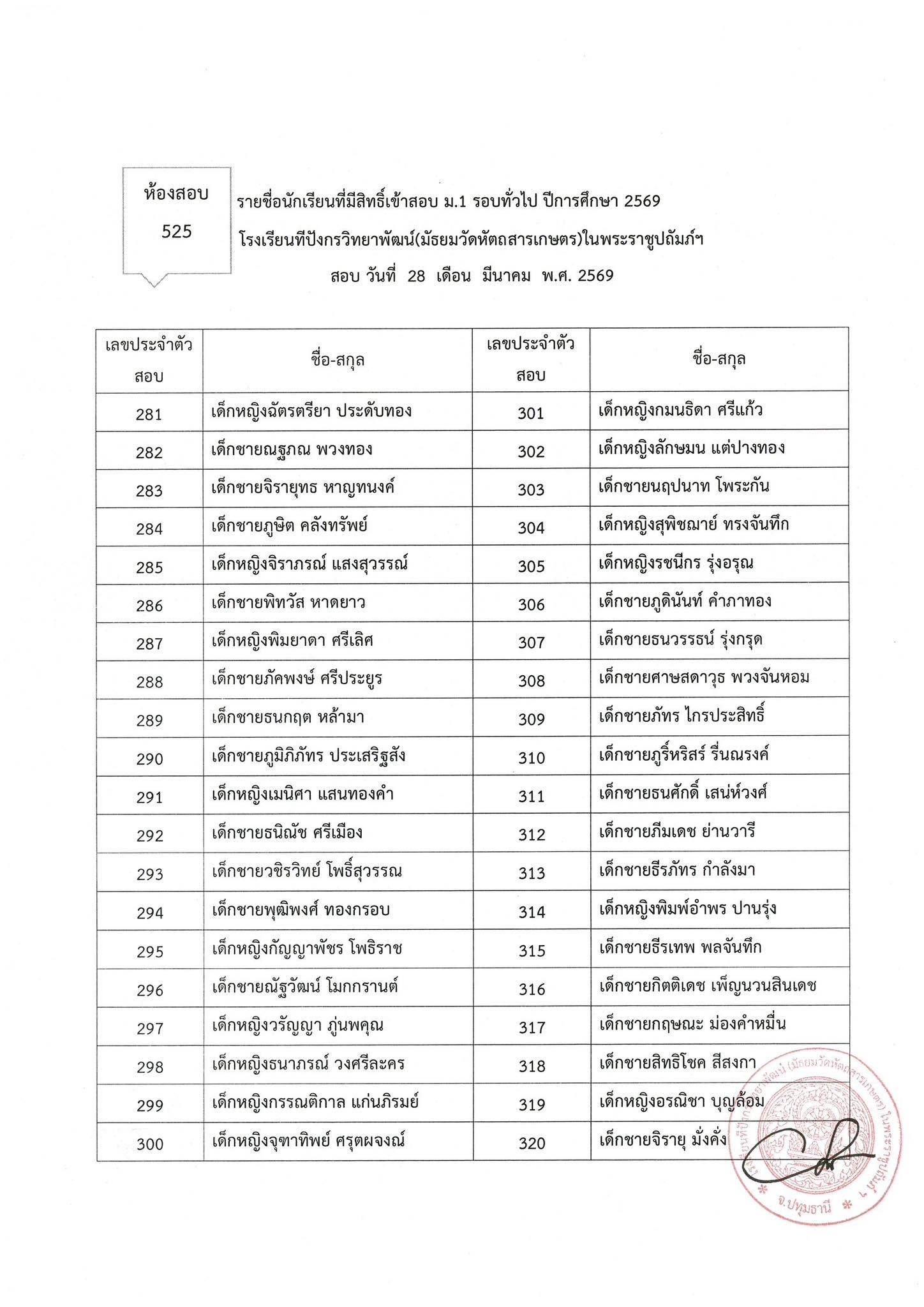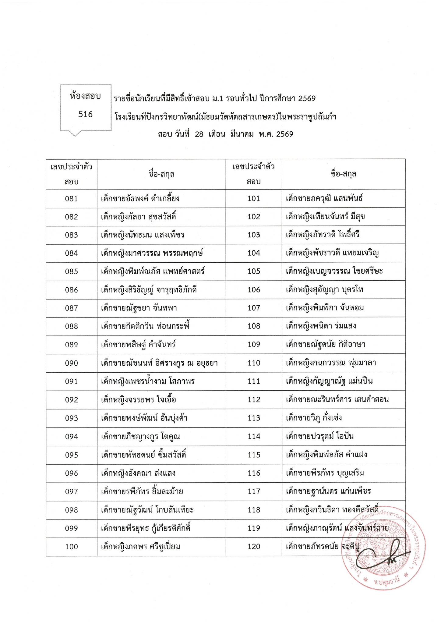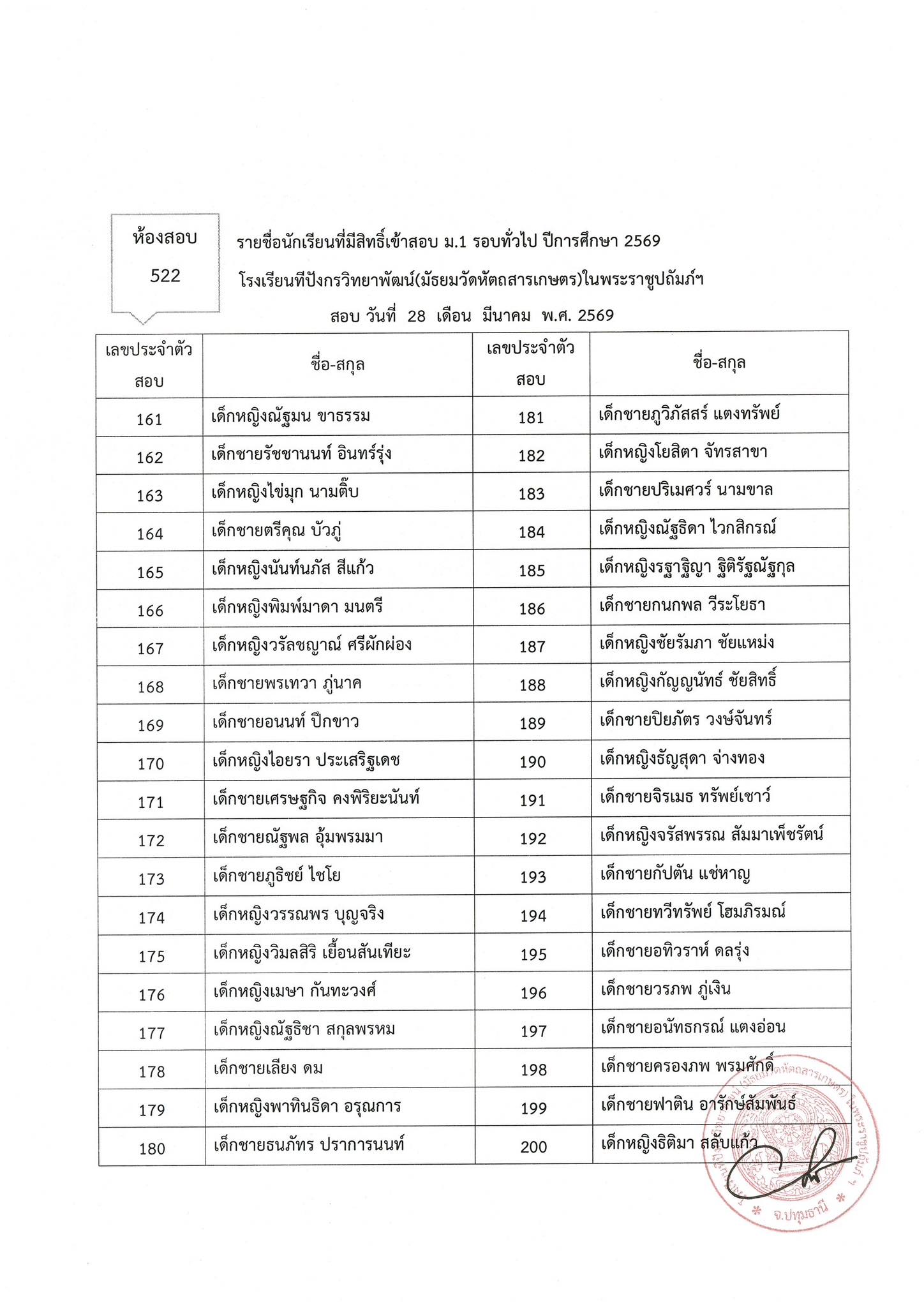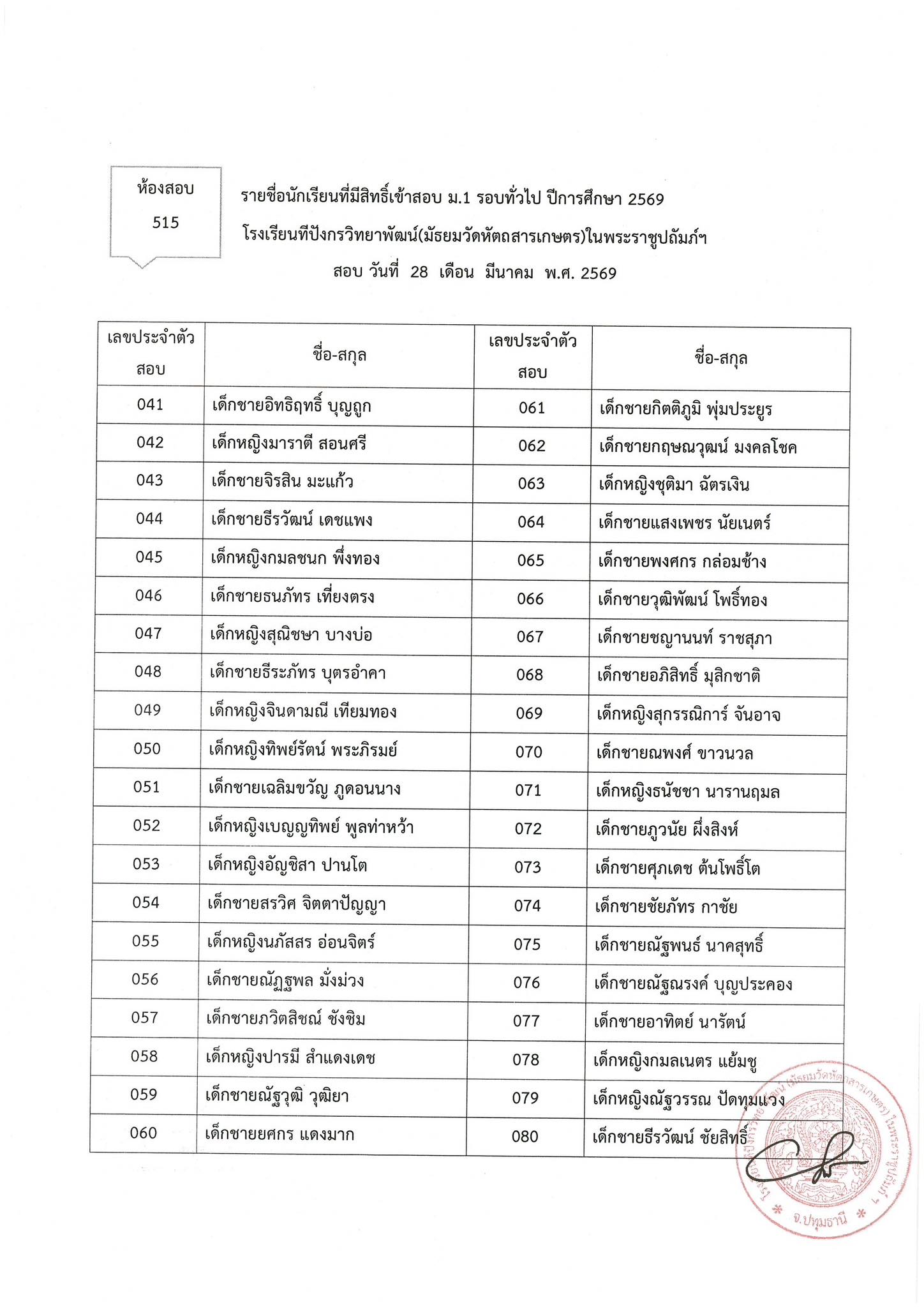 ประกาศรายชื่อผู้มีสิทธิ์สอบคัดเลือก ชั้นมัธยมศึกษาปีที่ 1 ห้องเรียนปกติ ปีการศึกษา 2569 สอบวันเสาร์ที่ 28 มีนาคม 2569 เวลา เวลา 8:30 – 11:50 น. หมายเหตุ แต่งกายด้วยชุดนักเรียน หากไม่มาสอบคัดเลือกในเวลาดังกล่าวถือว่าสละสิทธิ์ 24 มี.ค. 2569นายนวรัตน์ สุขสำราญประกาศ
