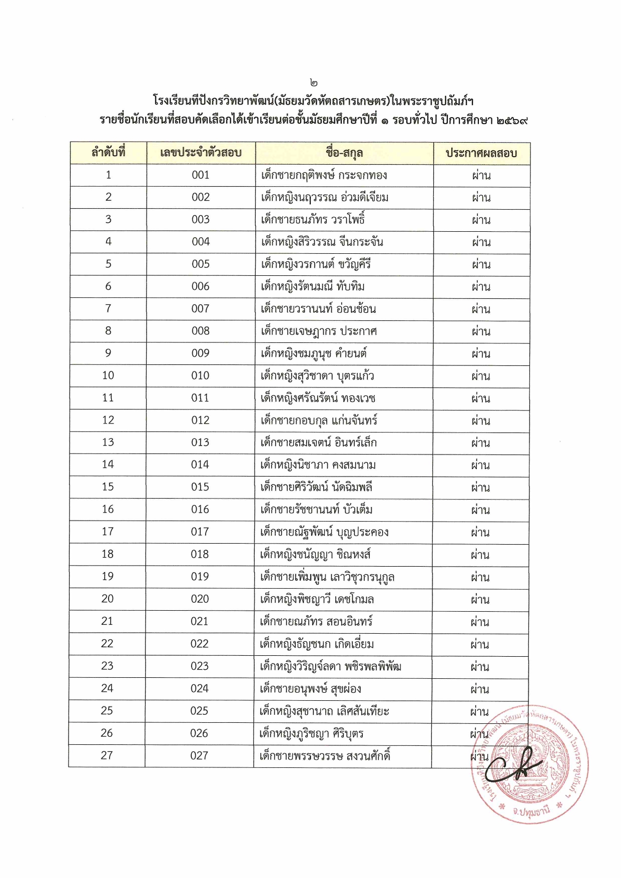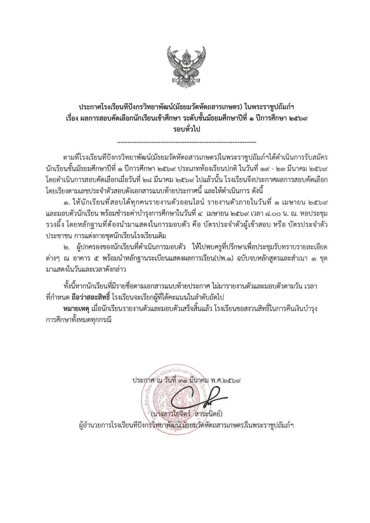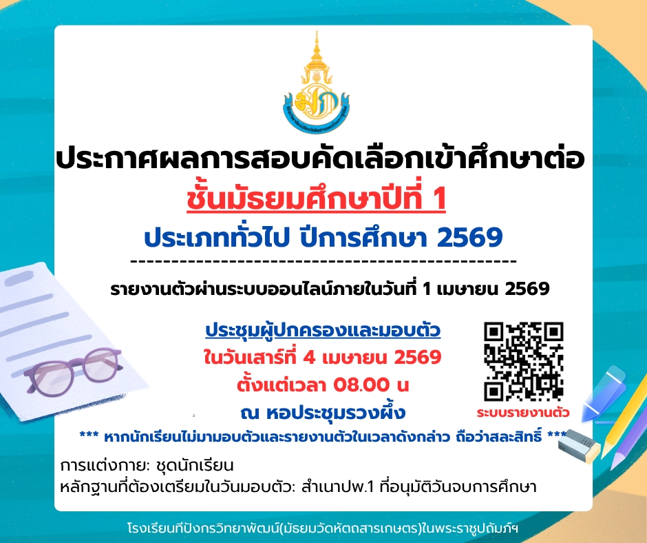 ประกาศผลการสอบคัดเลือกนักเรียนเข้าศึกษา ระดับชันมัธยมศึกษาปีที่ ๑ ปีการศึกษา ๒๕๖๓ รอบทั่วไป 31 มี.ค. 256931 มี.ค. 2026นายนวรัตน์ สุขสำราญประกาศ ผลการสอบคัดเลือกนักเรียนเข้าศึกษาต่อ นักเรียนชั้นมัธยมศึกษาปีที่ 1 ประเภททั่วไป ปีการศึกษา 2569 ให้นักเรียนที่สอบผ่านการคัดเลือกบันทึกข้อมูลยืนยันสิทธิ์ในระบบ ภายในวันที่ 1 เมษายน 2569 โรงเรียนที่ปังกรวิทยาพัฒน์(มัธยมวัดหัตถสารเกษตร)ในพระราชูปถัมภ์ฯ ตรวจสอบผลคะแนนสอบ ระบบรายงานตัว