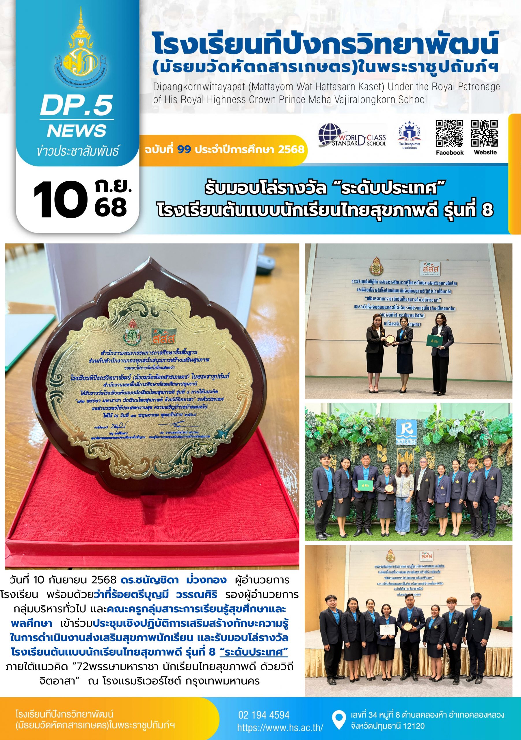 จุลสารฉบับที่ 99/2568 📌หัวข้อ : รับมอบโล่รางวัล “ระดับประเทศ” โรงเรียนต้นเเบบนักเรียนไทยสุขภาพดี รุ่นที่8 23 ก.ย. 2568นายนวรัตน์ สุขสำราญข่าวประชาสัมพันธ์